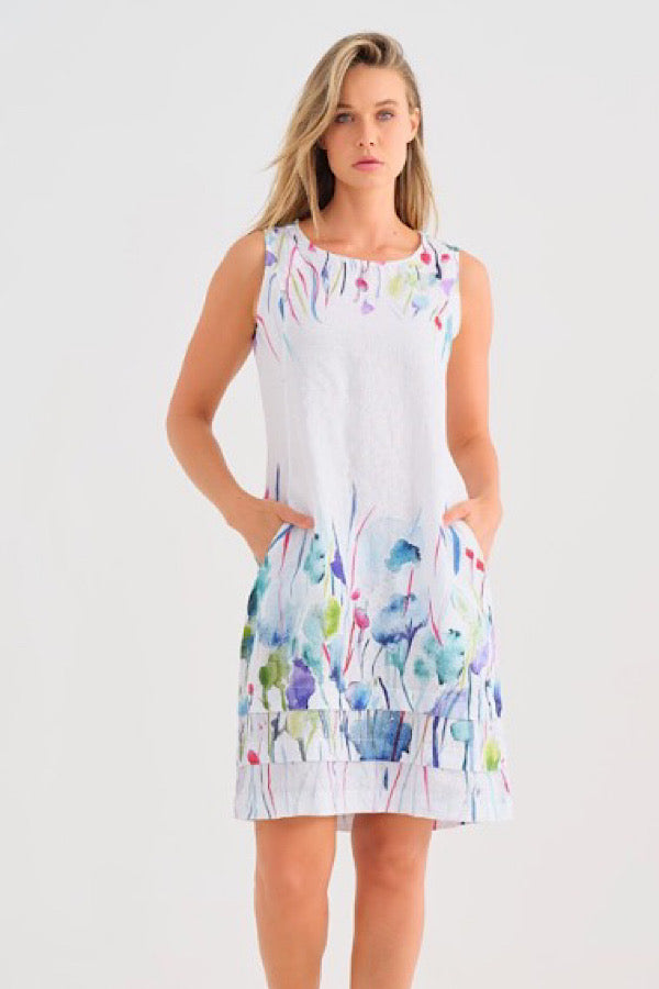 Simply Art by Dolcezza Dress “Misty Blossom” – fabulous 100% Linen white sleeveless dress with side pockets, pleating at hem, keyhole closure on the back, featuring artistic floral design of Majella LeBlanc (from Québec, Canada) painting in fresh colours palette. Spectacular dress for summer!