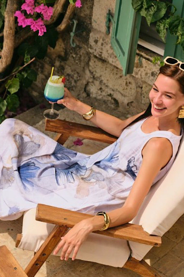 Simply Art by Dolcezza Dress “Indigo Melody” – fabulous 100% Linen off-white sleeveless easy fit flared dress with in-seam side pockets, featuring artistic floral design of Majella LeBlanc (from Québec, Canada) painting in deep indigo blue,. Stunning style, Indeed!