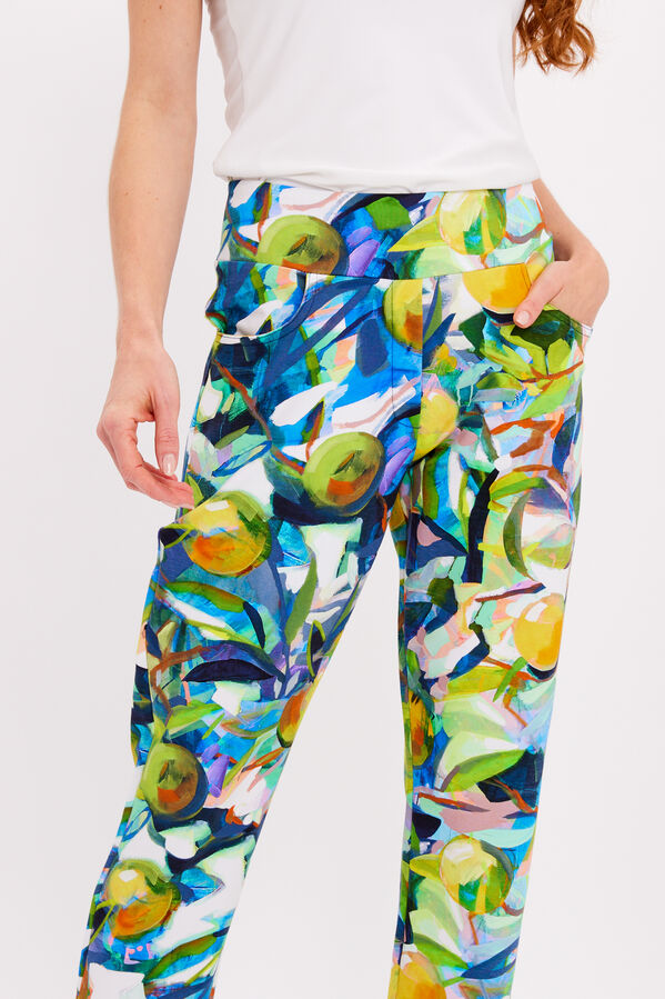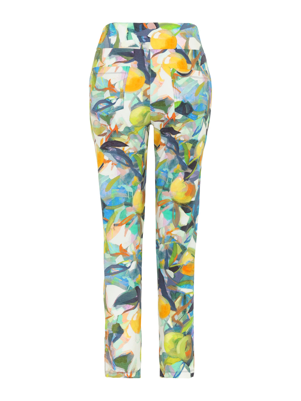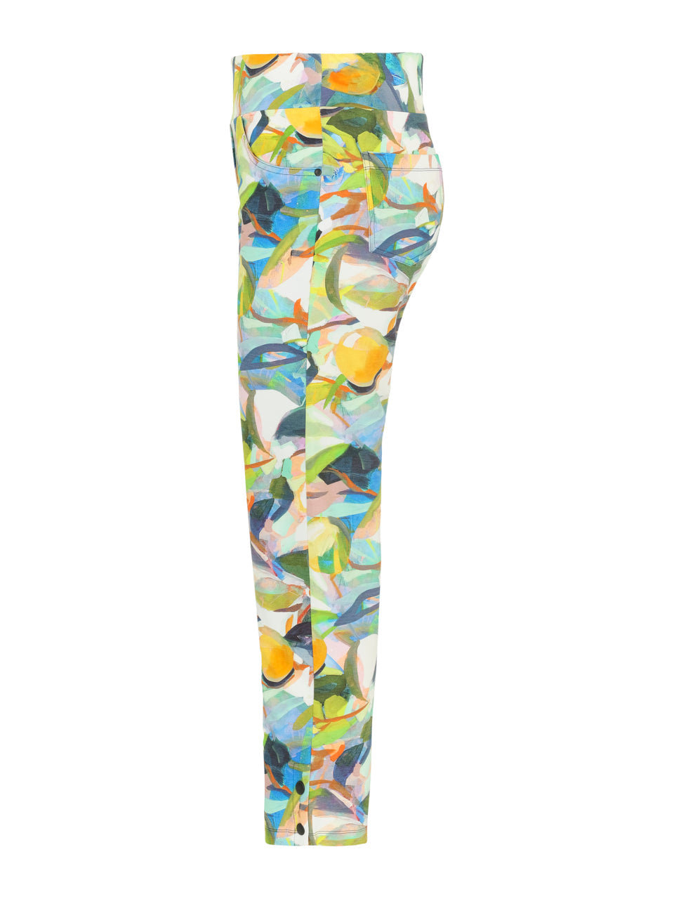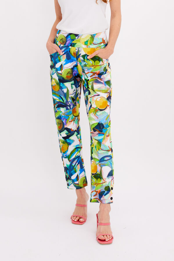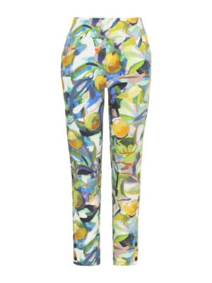 Add a playful pop of art with Dolcezza's 'Orangerie' trouser, part of the 'Orangerie 4' collection, these cropped trousers feature an all-over print by American artist Erin Gregory. Pull-on style with faux fly and pockets, finished in a slim fit with a double popper button hem detail. Pair with Dolcezza top style 24640 for a striking complete ensemble that will have heads turning!