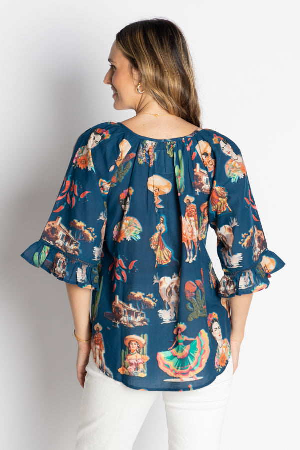Add vibrant style to your everyday wardrobe with the LulaLife Arriba Top. Designed in Australia and crafted from 100% cotton, this lightweight top offers a relaxed fit with a flattering V-neckline and soft gathers from the neck. The wide raglan sleeves with flounce detail and 3/4 length design bring effortless movement and comfort, while the curved hem makes it easy to style with skirts, shorts, or pants. Finished with a bold retro Mexican western-inspired digital print, this cotton top is perfect for casual outings, summer holidays, or everyday wear.