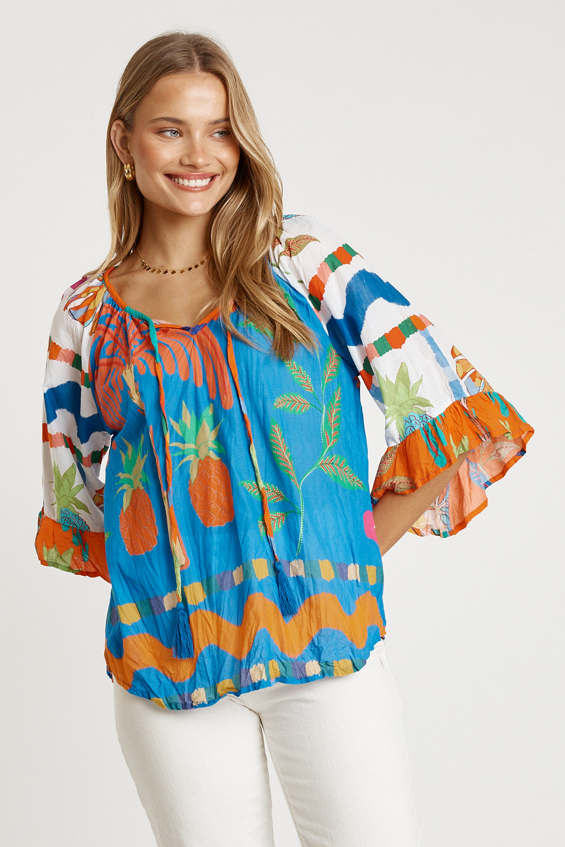 Full of colour and easy charm, the LulaLife Tasmin Top is a breezy everyday piece designed for relaxed comfort. Made from 100% cotton, it feels soft, breathable, and perfect for warm weather. The V neck with adjustable ties and tassels adds a playful touch, while the wide raglan sleeves with flounce hems bring movement and a feminine feel. With a 3/4 length sleeve, gently curved hem, and eye-catching mixed prints, this Australian-designed top pairs effortlessly with denim, linen, or summer pants for a fun, easygoing look.